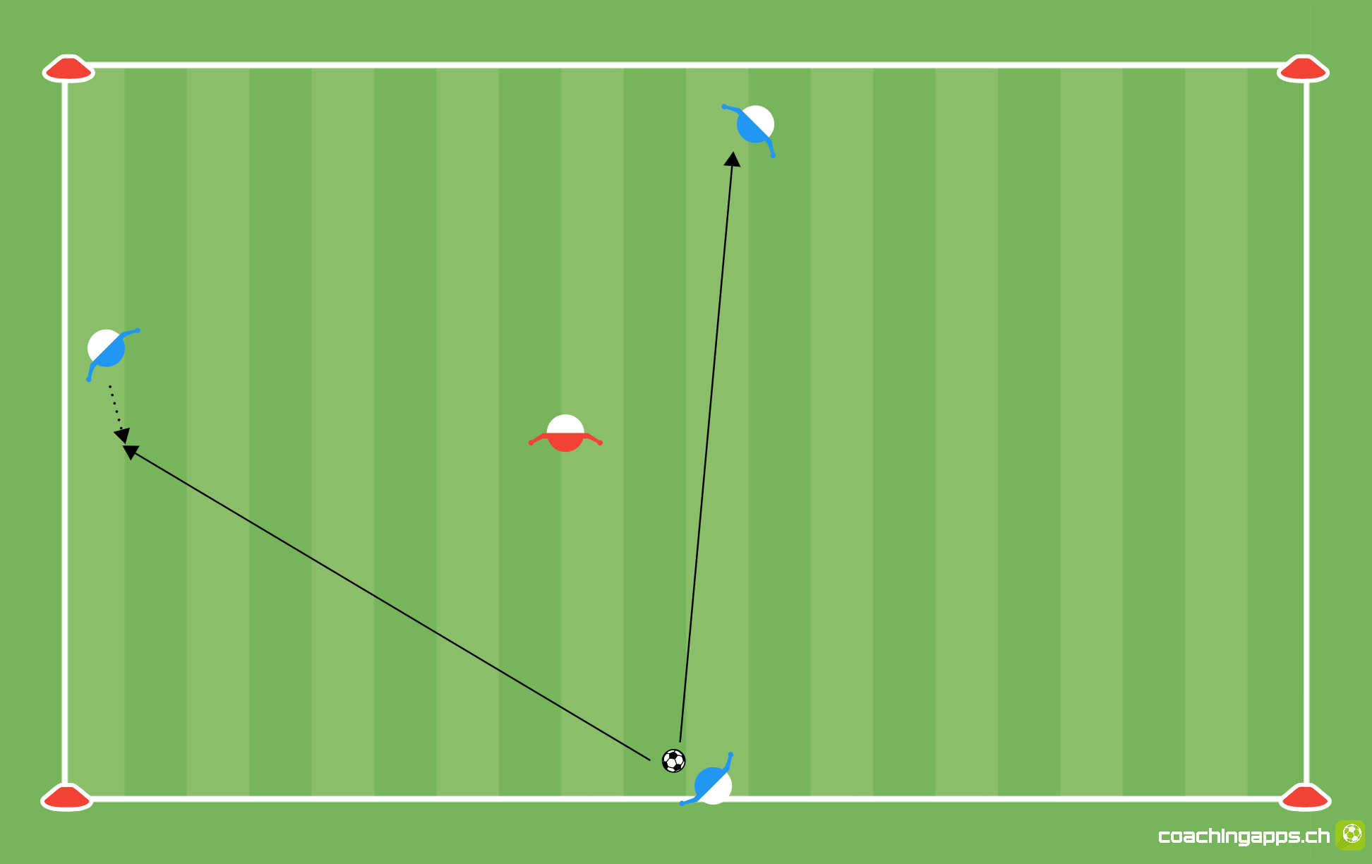 Spiel 3 gegen 1 auf Ballbesitz. Berührt der Gegenspieler den Ball, tauscht er mit dem Spieler, der den Ballverlust hatte.