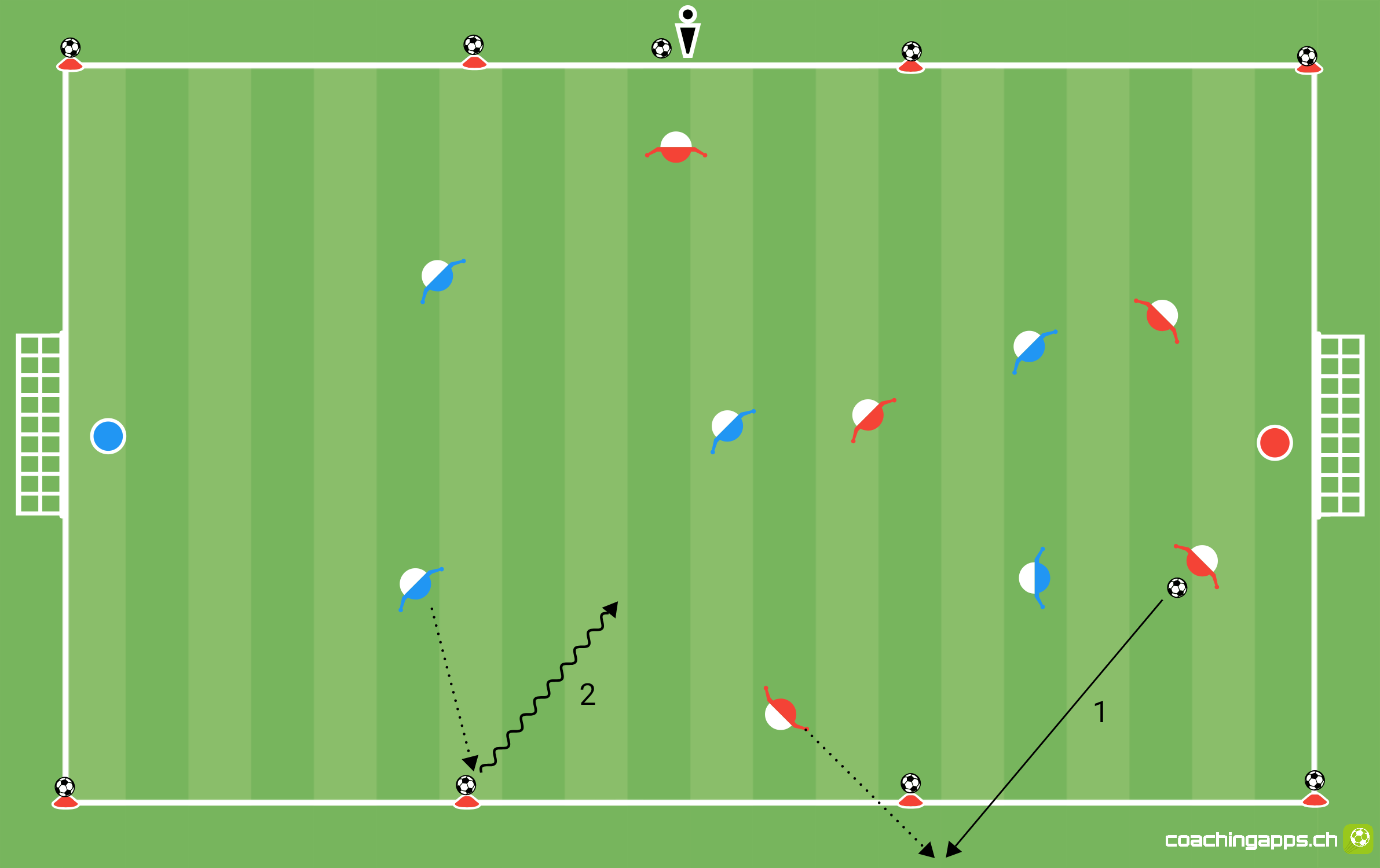 Freies Spiel auf zwei Tore. Sobald ein Ball das Spielfeld verlässt, muss dieser Ball geholt und an der freiwerdenden Stelle am Spielfeldrand deponiert werden (1). In der Zwischenzeit kann der gegnerische Spieler den nächstgelegenen Ball ins Spiel bringen und die so