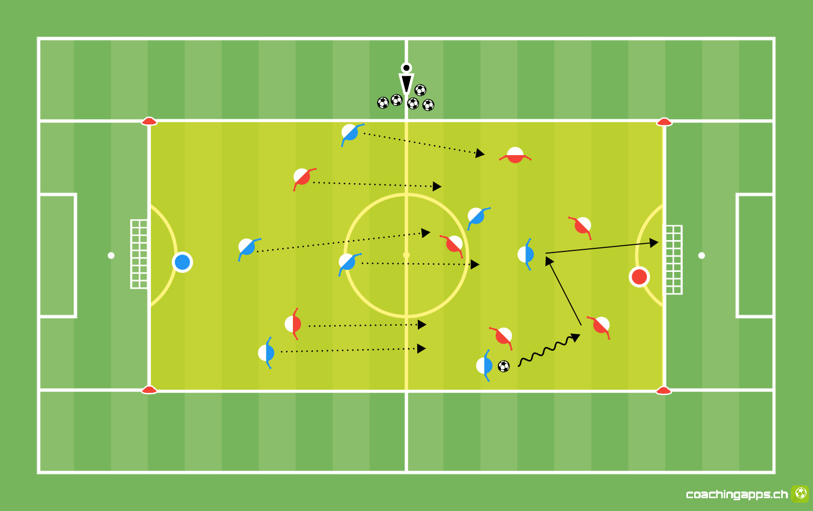 Freies Spiel – damit ein Tor zählt, müssen alle Spieler in die gegnerische Spielfeldhälfte aufrücken.