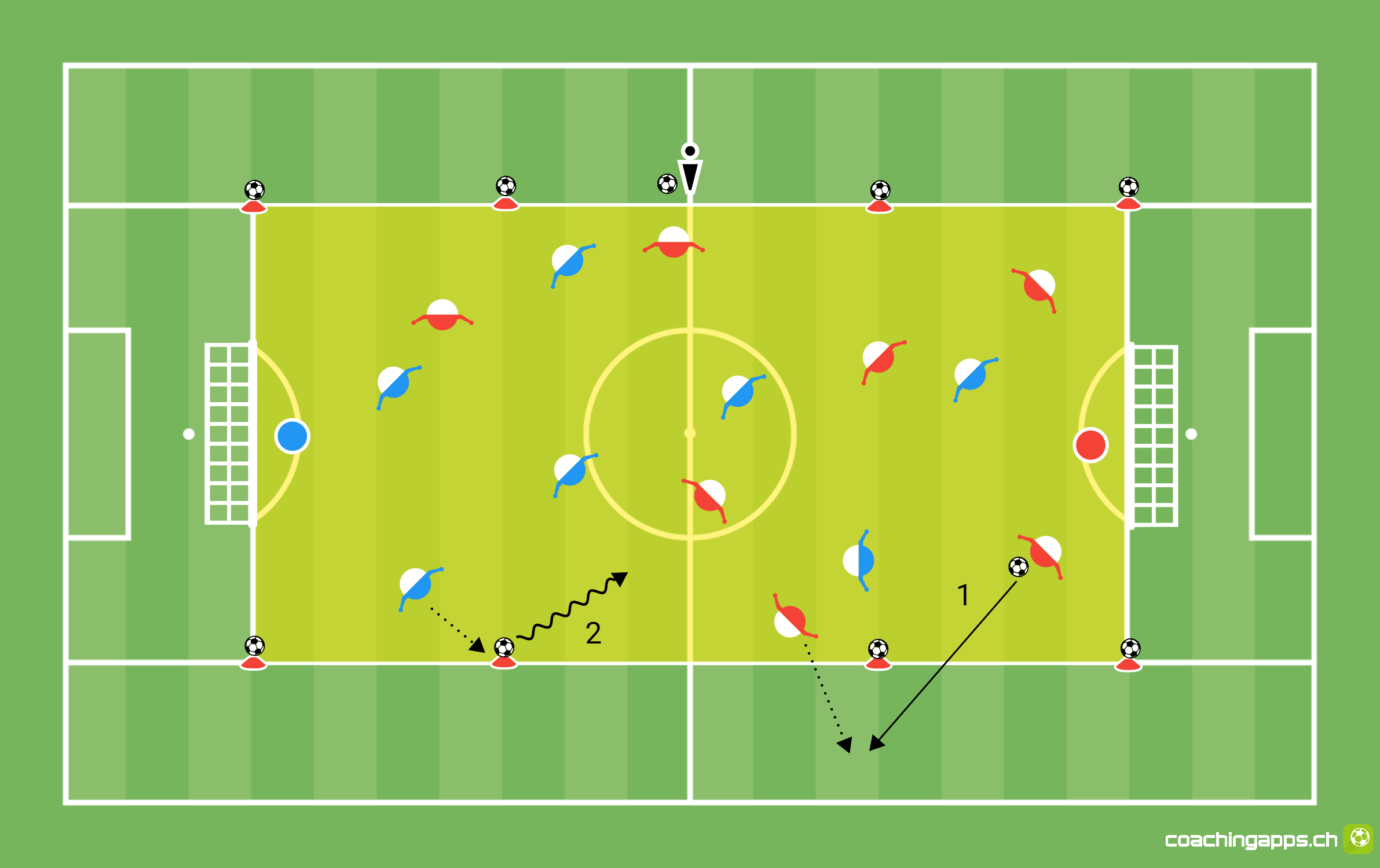 Freies Spiel auf zwei Tore. Sobald ein Ball das Spielfeld verlässt, muss dieser Ball geholt und an der freiwerdenden Stelle am Spielfeldrand deponiert werden (1). In der Zwischenzeit kann der gegnerische Spieler den nächstgelegenen Ball ins Spiel bringen und die so