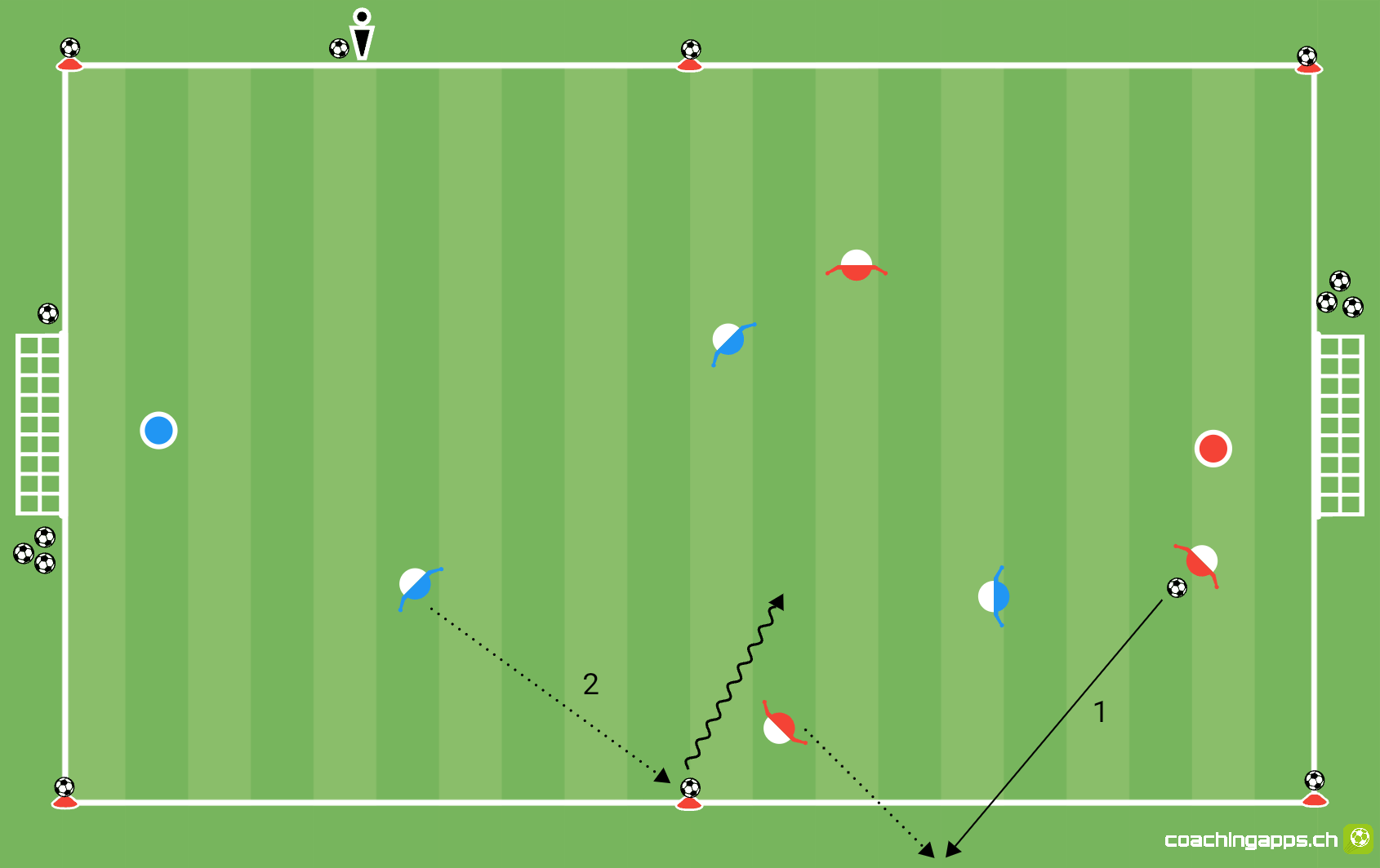 Freies Spiel auf zwei Tore. Sobald ein Ball das Spielfeld verlässt, muss dieser Ball geholt und an der freiwerdenden Stelle am Spielfeldrand deponiert werden (1). In der Zwischenzeit kann der gegnerische Spieler den nächstgelegenen Ball ins Spiel bringen und die so entstehende Überzahlsituation ausnutzen (2).