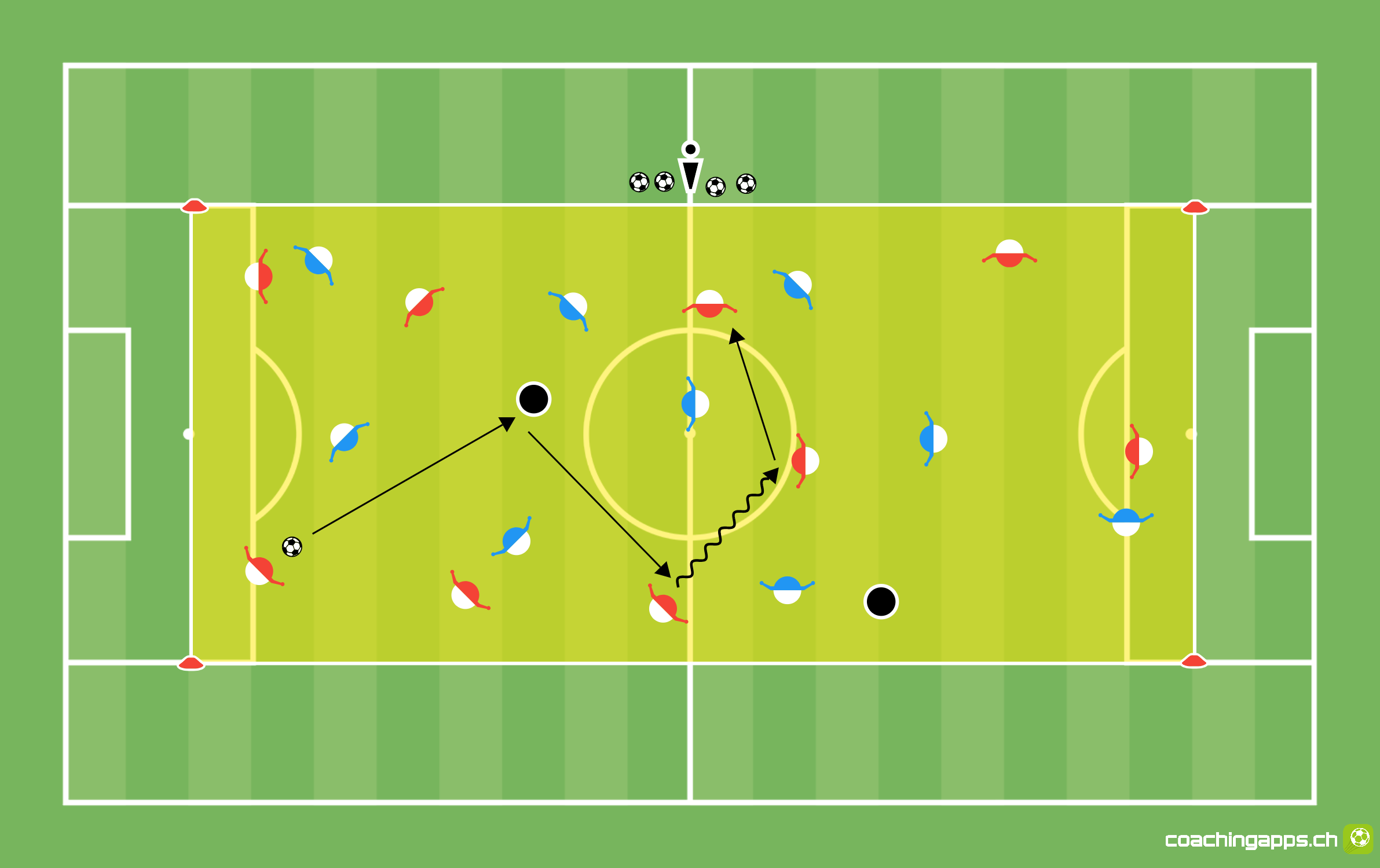 Nach einer vorgegebenen Anzahl Pässe (5 bis 8) erhält das Team einen Punkt und das Rondo wird fortgesetzt.