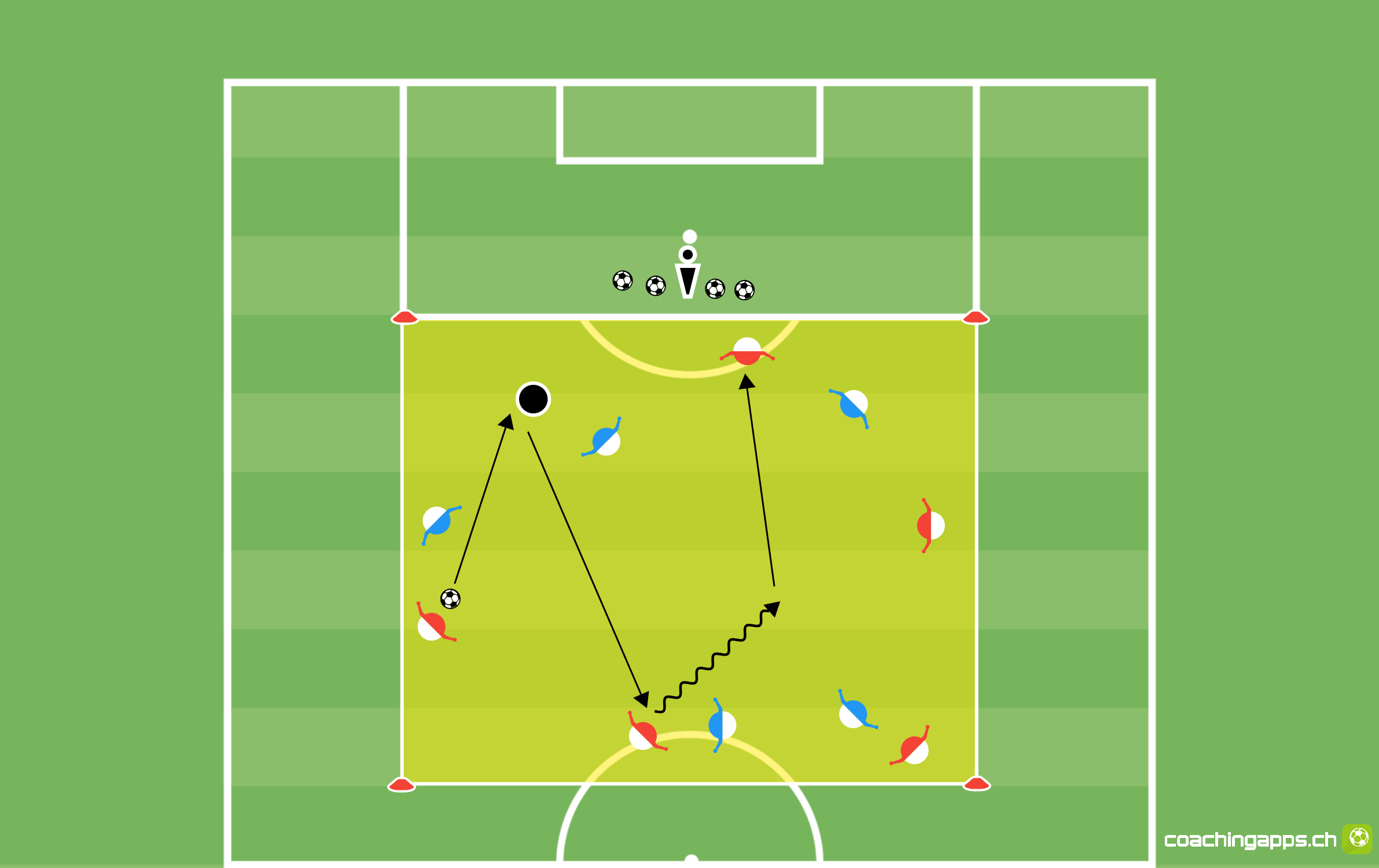 Nach einer vorgegebenen Anzahl Pässe (5 bis 8) erhält das Team einen Punkt und das Rondo wird fortgesetzt.