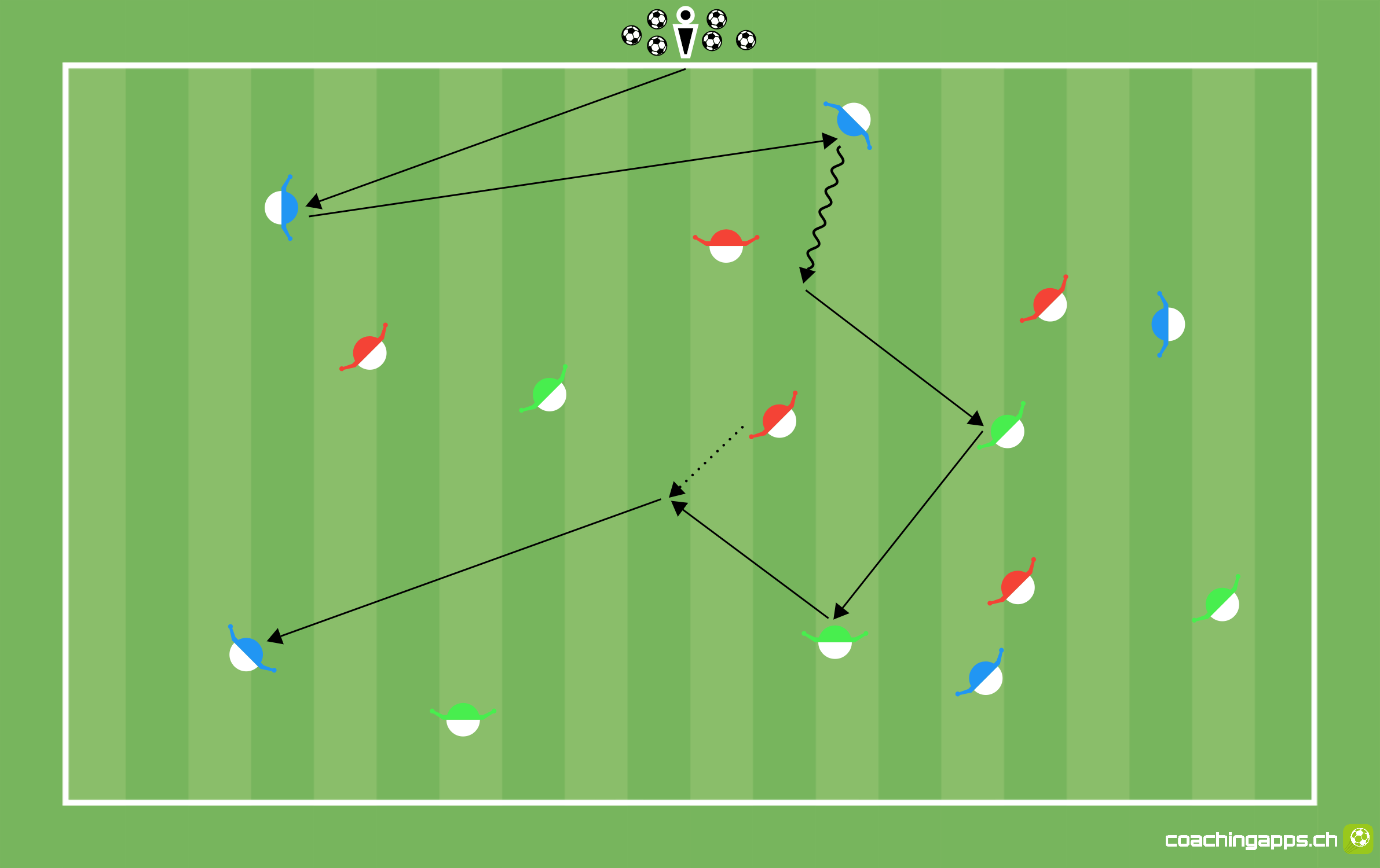 Jeweils 2 Teams (BLAU und GRÜN) spielen gegen 1 Team (ROT) auf Ballhalten. Nach 10 erfolgreichen Pässen erhalten diese 2 Teams je 1 Punkt. Sobald das dritte Team (ROT) den Ball erobern kann, wird jenes Team zum verteidigenden Team, welches den Ball verloren hat. Das Spiel auf Ballhalten wird ohne Unterbruch fortgesetzt.
