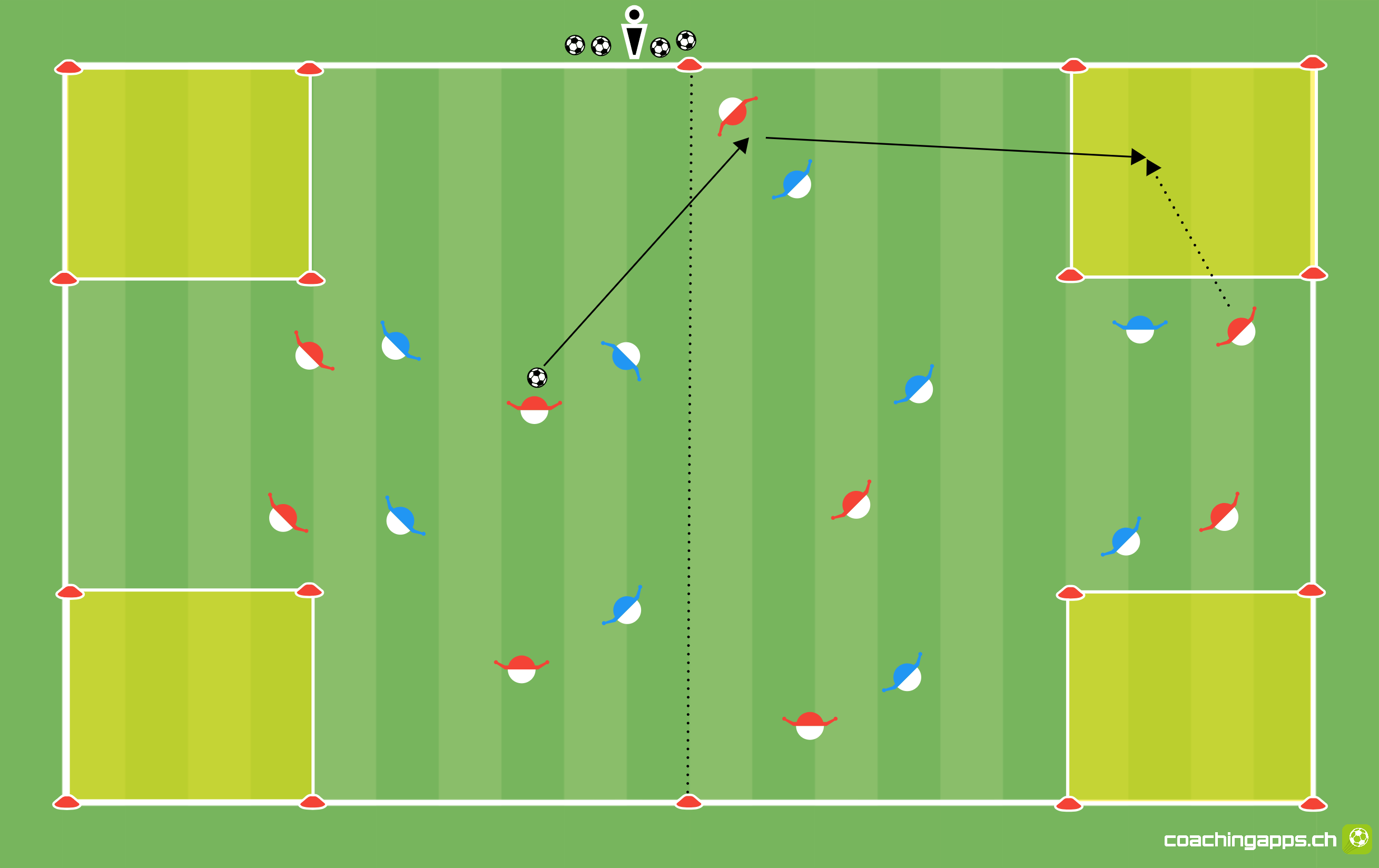 Das Spielfeld der Anzahl Spieler und dem Spielniveau anpassen. Bei einem 9 gegen 9 (Grafik) ein Feld von ca. 80 x 40 Metern wählen. In den vier Ecken Zonen markieren (ca. 8 x 8 Meter). Zwei gleich starke Teams bilden.