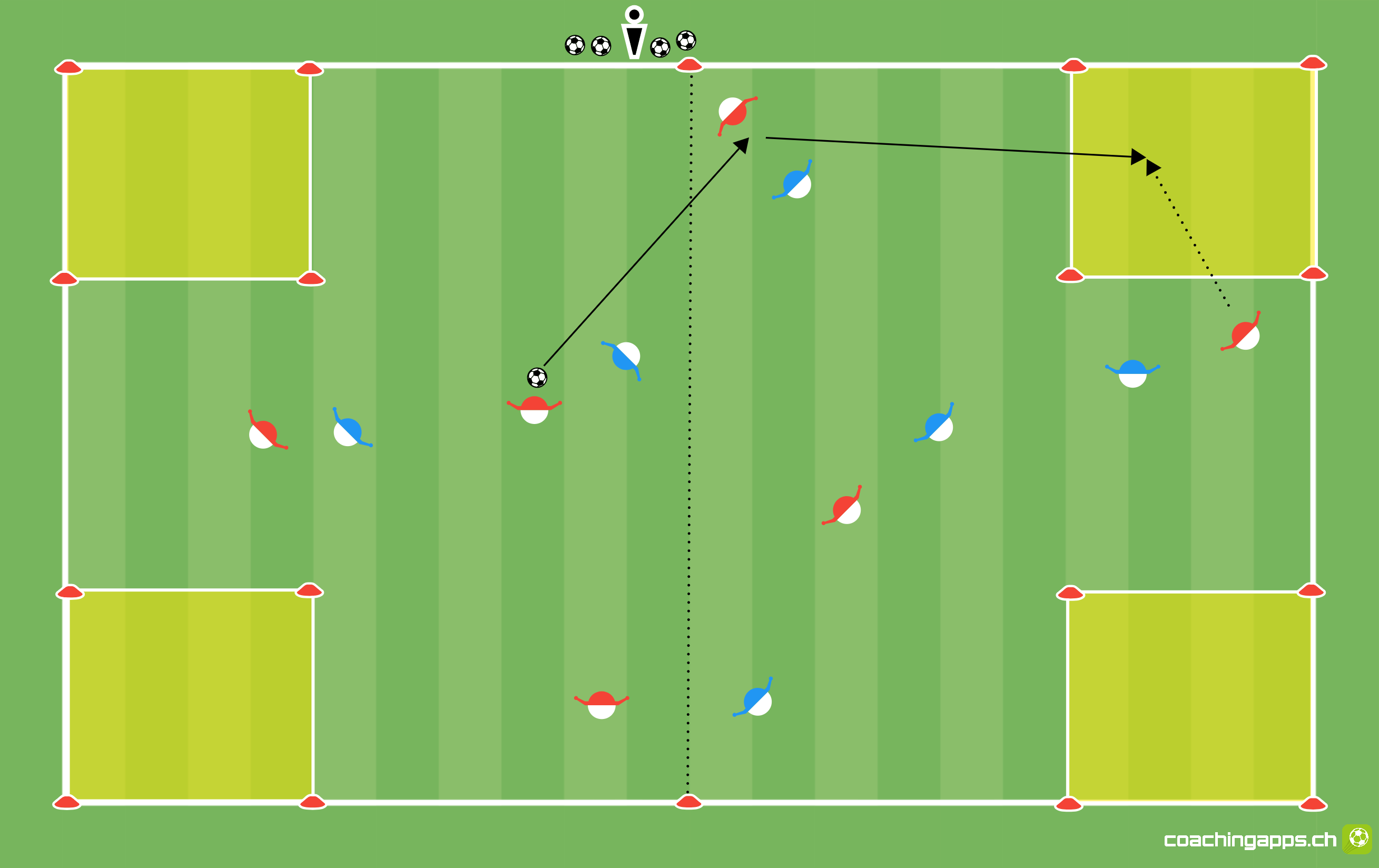 Das Spielfeld der Anzahl Spieler und dem Spielniveau anpassen. Bei einem 6 gegen 6 (Grafik) ein Feld von ca. 50 x 30 Metern wählen. In den vier Ecken Zonen markieren (ca. 5 x 5 Meter). Zwei gleich starke Teams bilden.