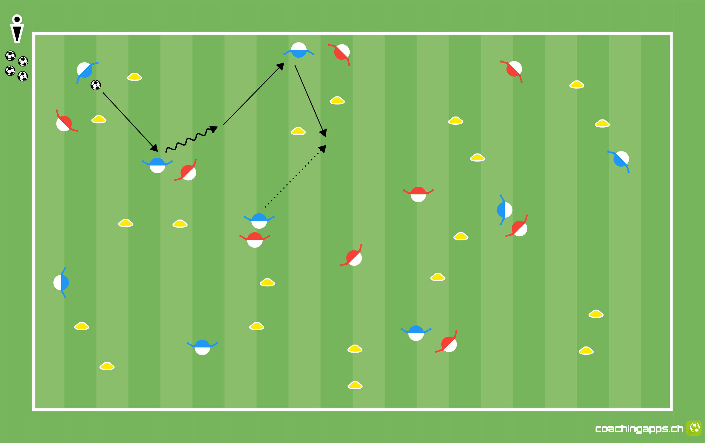 Die Teams versuchen den Ball in den eigenen Reihen zu halten. Für einen Punktgewinn muss ein erfolgreicher Pass durch ein Hütchentor erfolgen. Der Pass gilt nur als erfolgreich, wenn er flach gespielt wird und dabei die Hütchen nicht berührt werden.