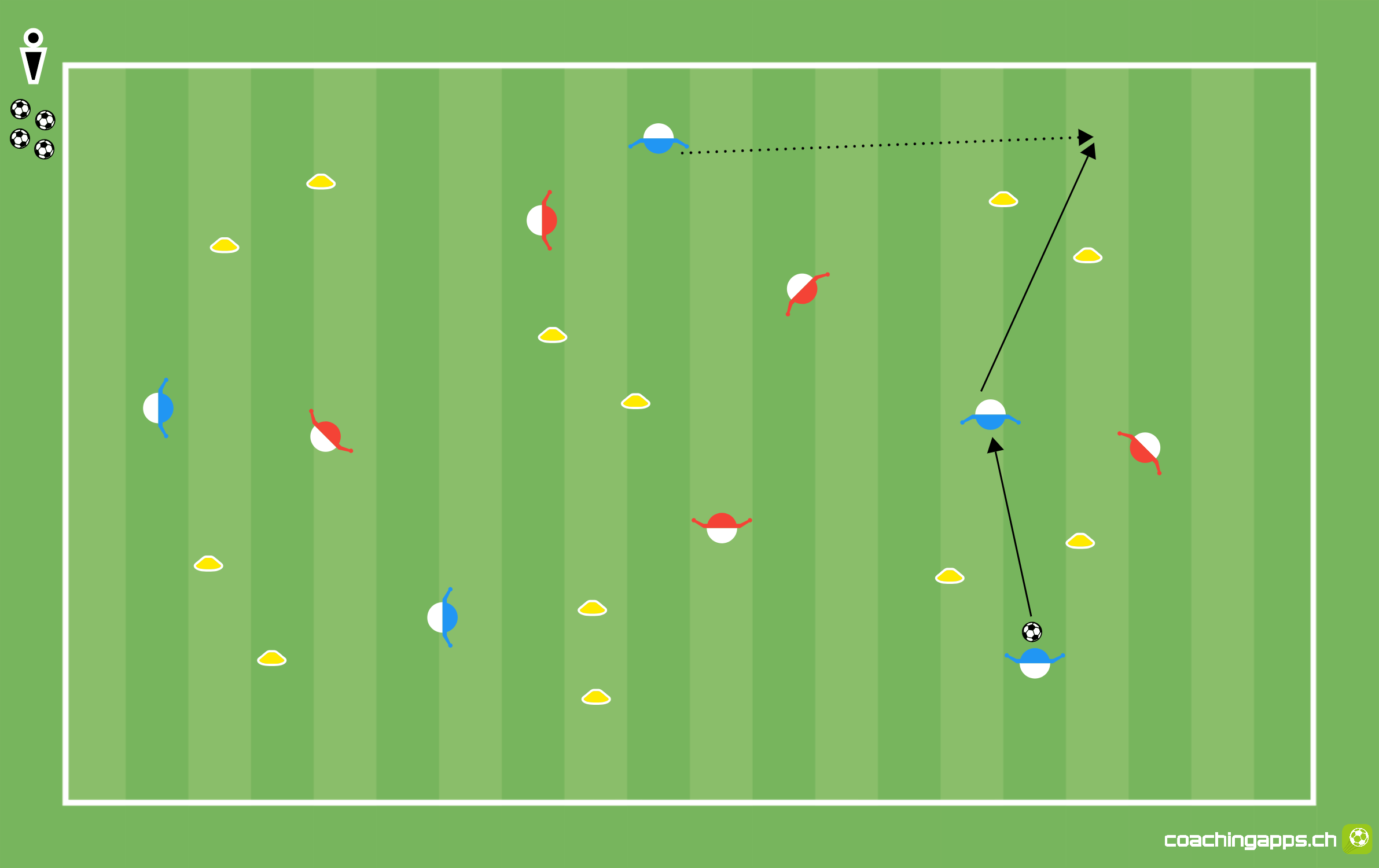 Die Teams versuchen den Ball in den eigenen Reihen zu halten. Für einen Punktgewinn muss ein erfolgreicher Pass durch ein Hütchentor erfolgen. Der Pass gilt nur als erfolgreich, wenn er flach gespielt wird und dabei die Hütchen nicht berührt werden.