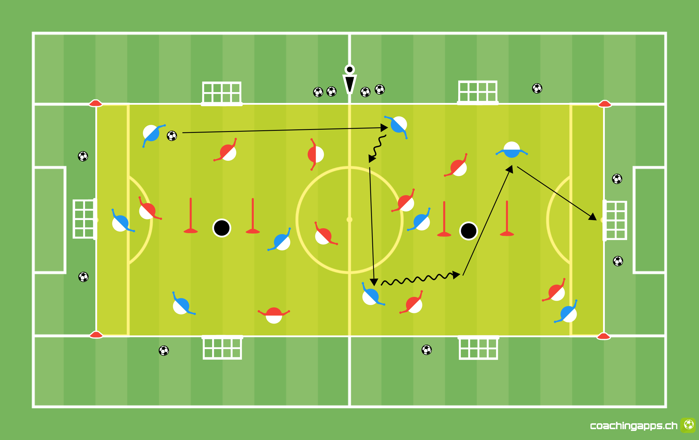 Möglichkeit B: Nach einer vorgegebenen Anzahl Pässe (z.B. 6 Pässe) darf auf eines der vier Minitore ein Punkt erzielt werden. Die Spielform wird durch das Zuspiel eines neuen Balles durch den Trainer fortgeführt.