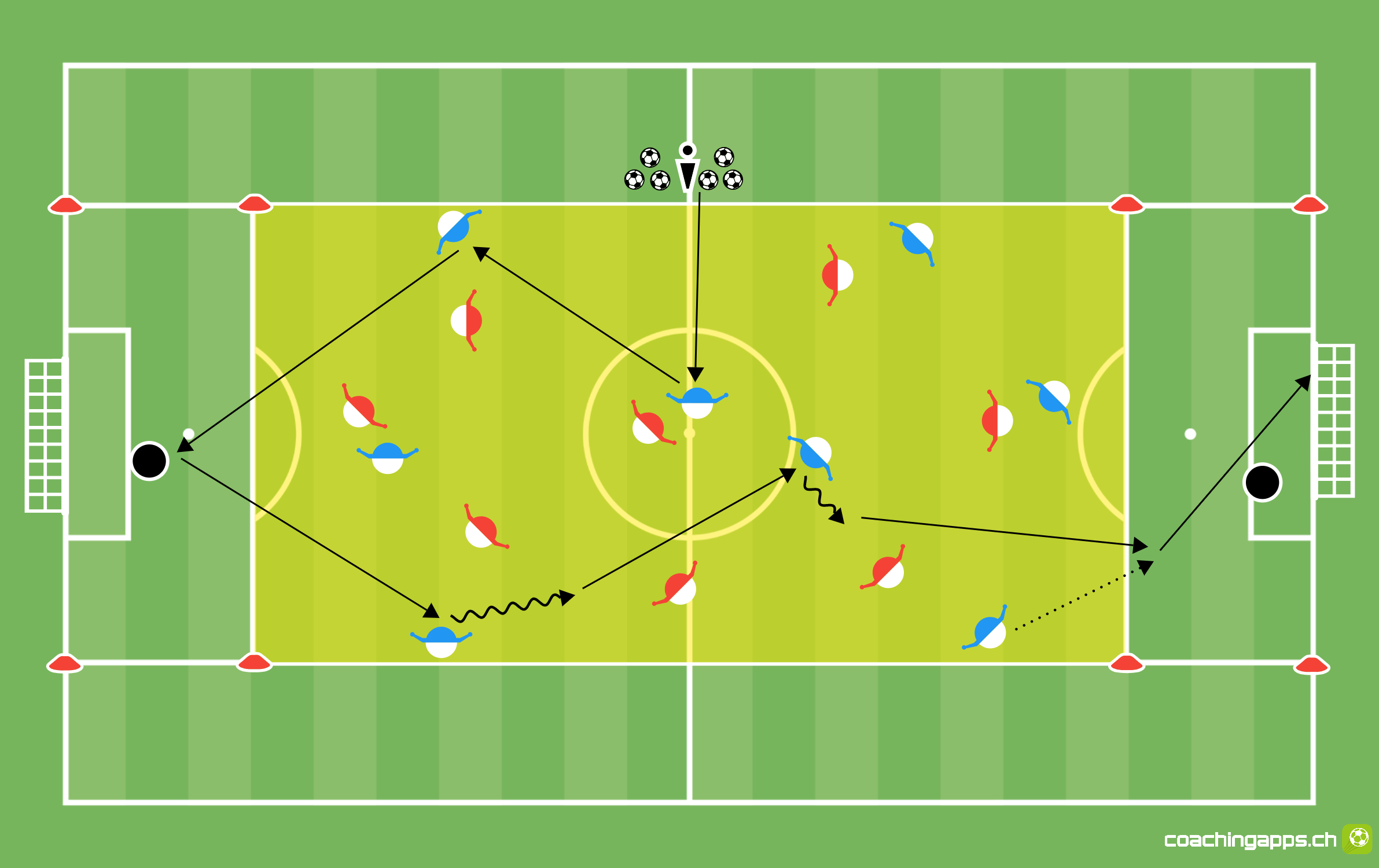 Das Spiel beginnt jeweils in der Mittelzone durch das Zuspiel der Trainerin oder des Trainers. Das ballbesitzende Team BLAU versucht, nach 3 bis 5 erfolgreichen Pässen in der Mittelzone einen Goalie anzuspielen und im Anschluss sogleich auf das gegenüberliegende Tor abzuschliessen.